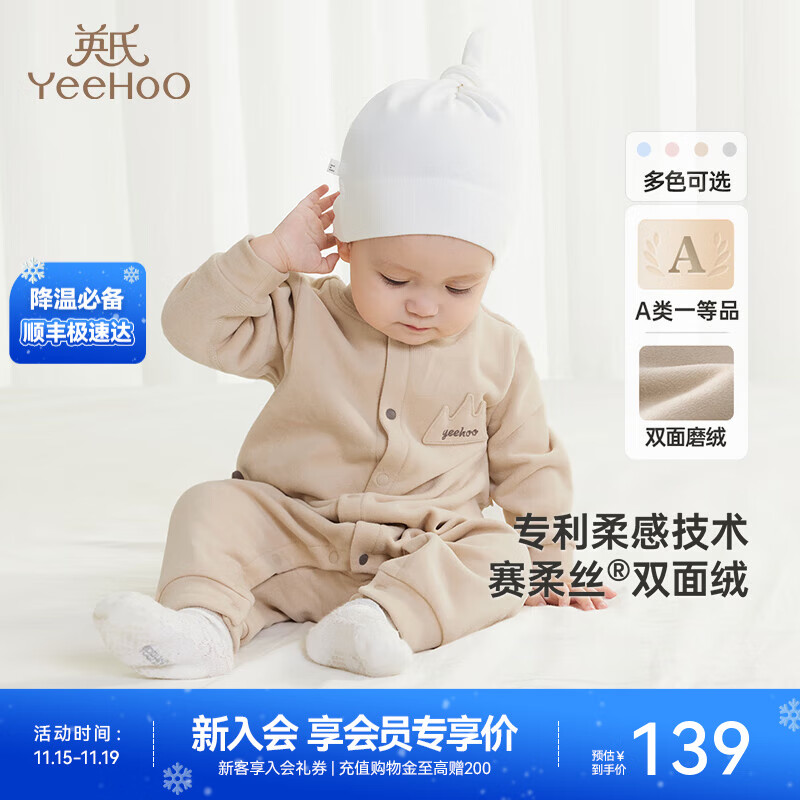 英氏婴儿衣服秋冬双面绒保暖男童女童连体衣爬服宝宝衣服 浅柔杏【襟蛤款】 80cm (推荐9-18个月)