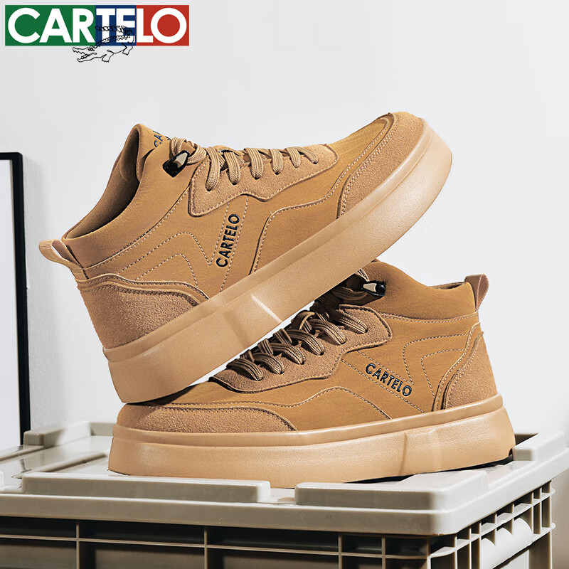 卡帝乐鳄鱼男鞋秋季新款潮流时尚百搭软弹舒适高帮板鞋男厚底男士休闲鞋 黄棕 QH8033 40