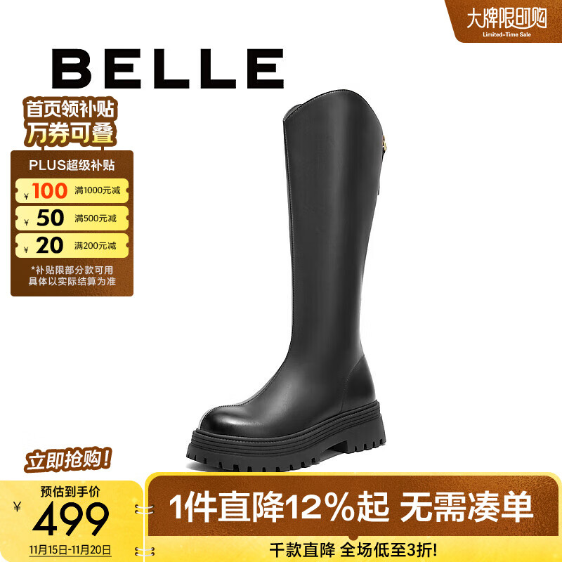百丽(Belle)金晨明星同款厚底小V靴弹力靴女冬季商场款长靴B9D1DDG4预售 黑仙草(微光皮面)- 绒里 37 (235mm)