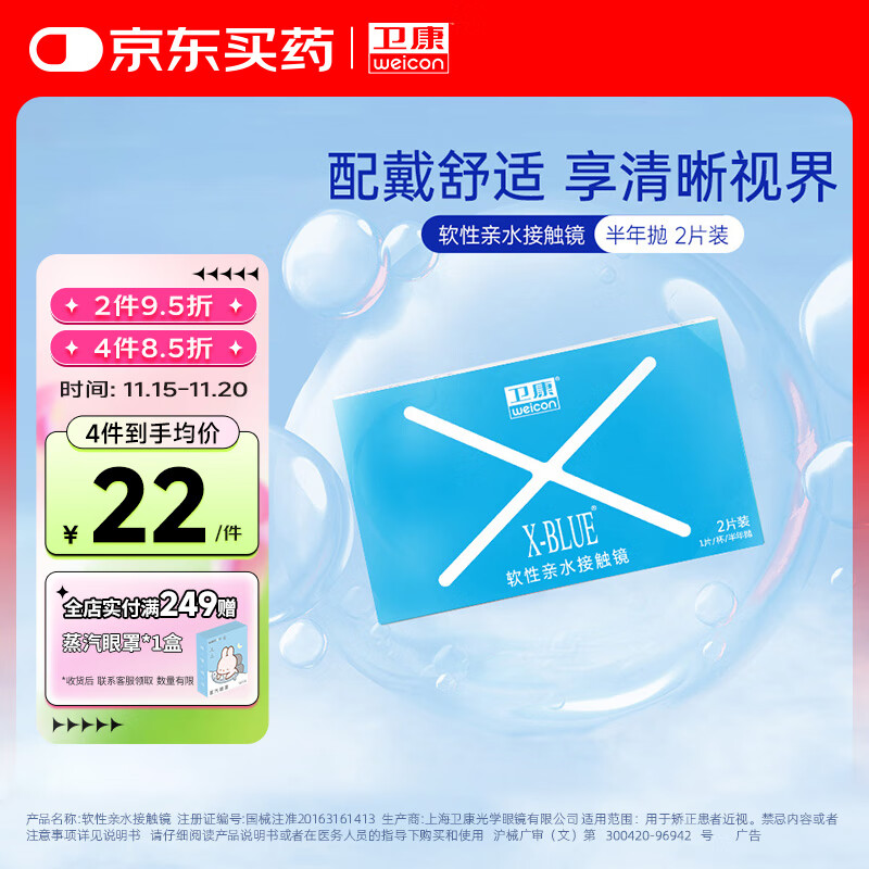 卫康 X-blue 高清高度数 透明近视隐形眼镜 半年抛2片装 500度