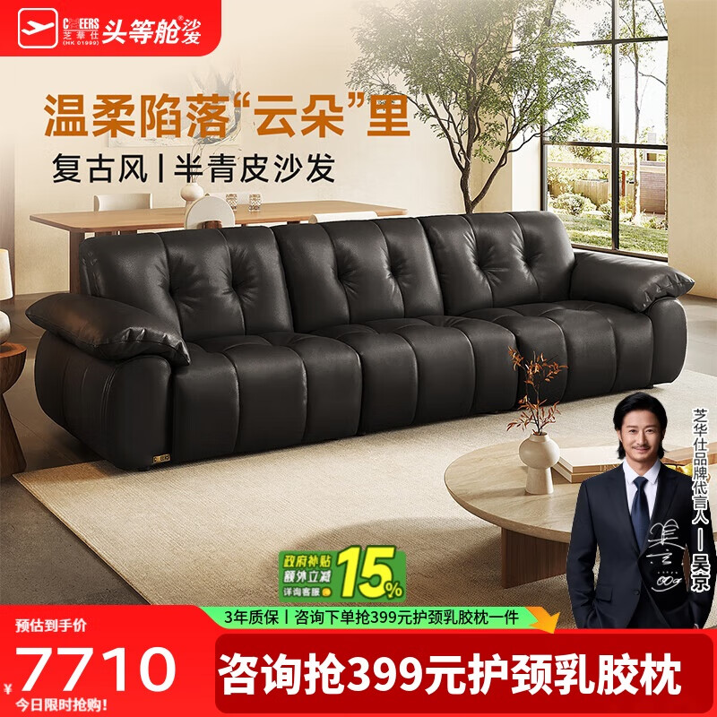 芝华仕(CHEERS)大黑牛真皮沙发复古云朵客厅2025新款半青皮沙发3176B黑3.2m
