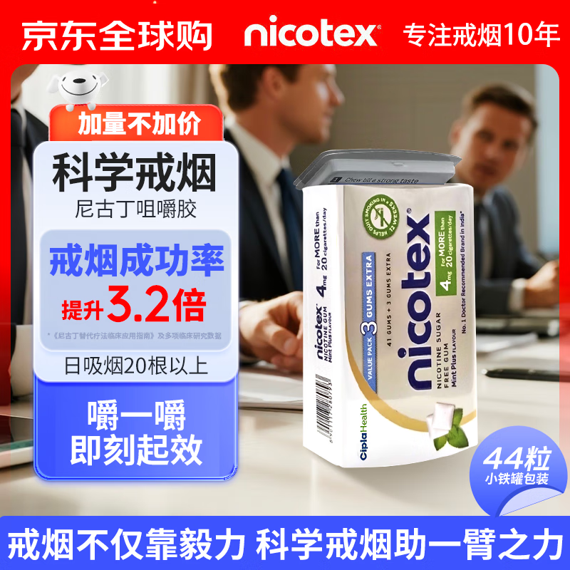 Nicotex 戒烟药戒烟替代品尼古丁咀嚼胶戒烟口香糖 戒烟专用烟瘾缓解薄荷无糖4mg*44粒