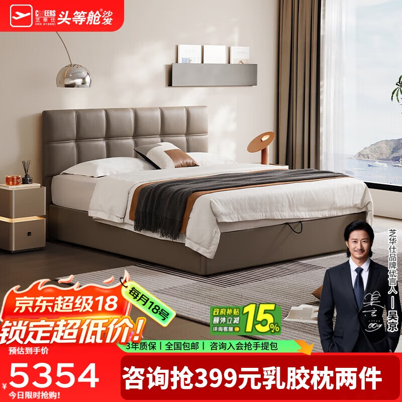 芝华仕五星皮床主卧双人床平移储物床真皮意式轻奢床带床垫C631咖1.5m