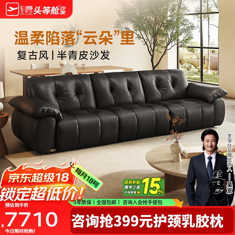 芝华仕(CHEERS)大黑牛真皮沙发复古云朵客厅2025新款半青皮沙发3176B黑3.2m