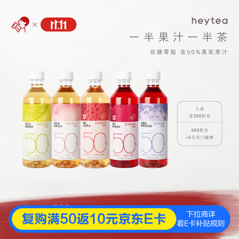 喜茶50%果汁茶 低糖0脂果汁茶饮料5口味混合装450ml*5瓶