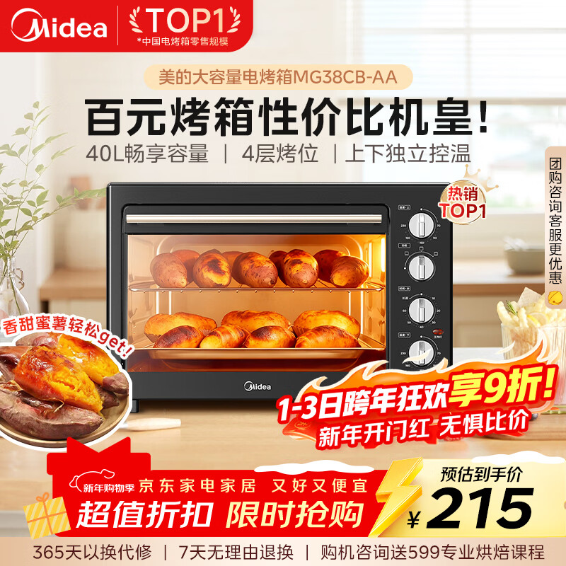美的(Midea)40L大容量多功能电烤箱家用专业烘焙 上下独立控/温机械操控/四层烤位MG38CB-AA三代