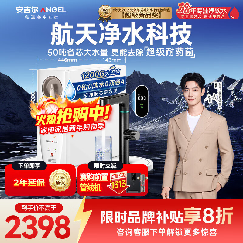 安吉尔家用净水器玉龙Pro1200G反渗透厨下直饮净水机5年长效RO膜过滤纯水净饮机J3673-ROC150型