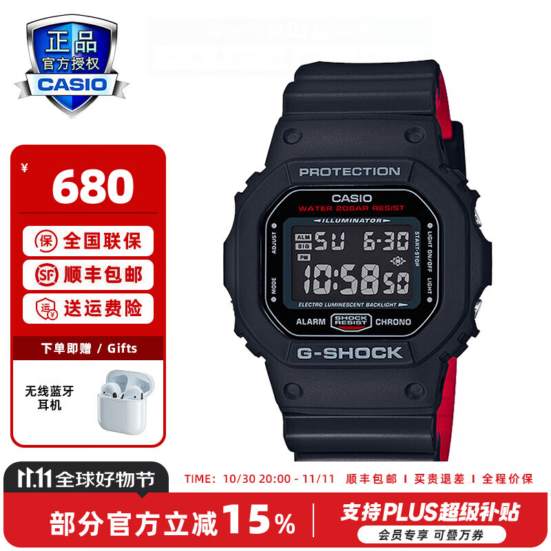 卡西欧(CASIO)【全国联保】小方块手表男女时尚潮流baby-g/g-shock情侣电子表 DW-5600UHR-1PR男款