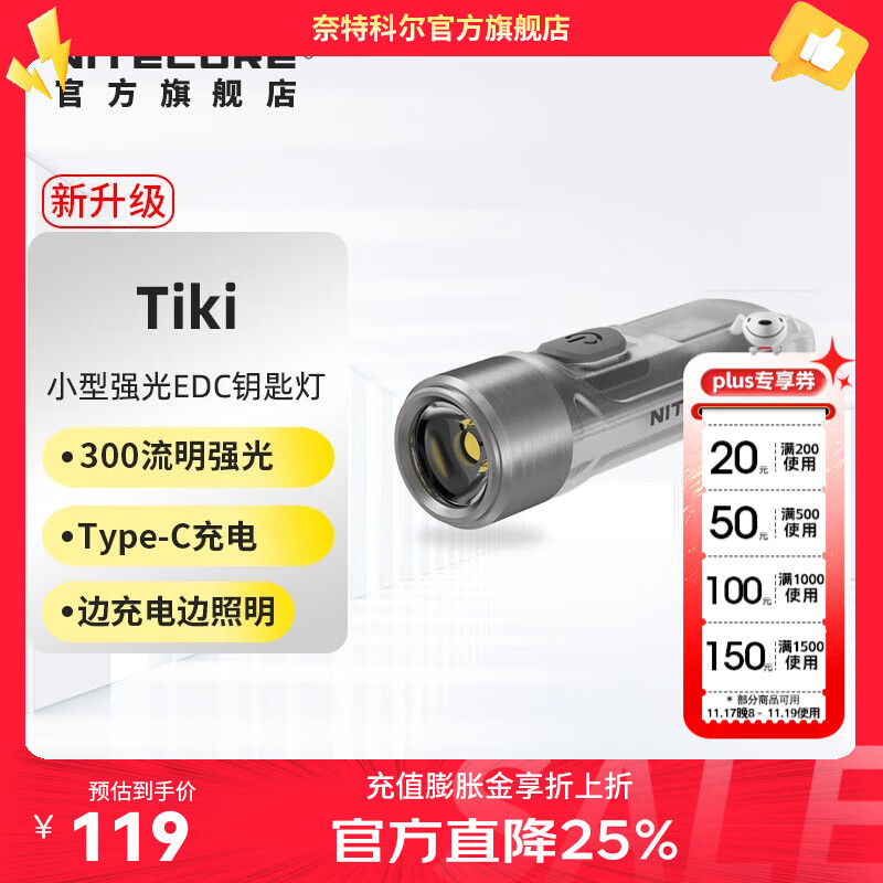奈特科尔tiki小手电筒迷你强光可充电超亮便携式多功能家用户外钥匙扣手电 Tiki【高显色光】