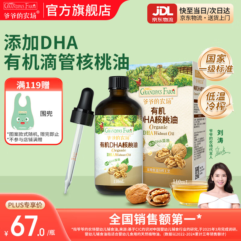 爷爷的农场核桃亚麻籽牛油果油宝宝辅食油热炒油 滴管小瓶营养食用油 DHA有机核桃油110ml