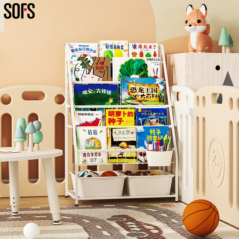 SOFS儿童书架落地铁艺绘本架宝宝简易小书柜多层书报杂志架幼儿图书玩具收纳架子 L码(5+1)层2盒 无轮子
