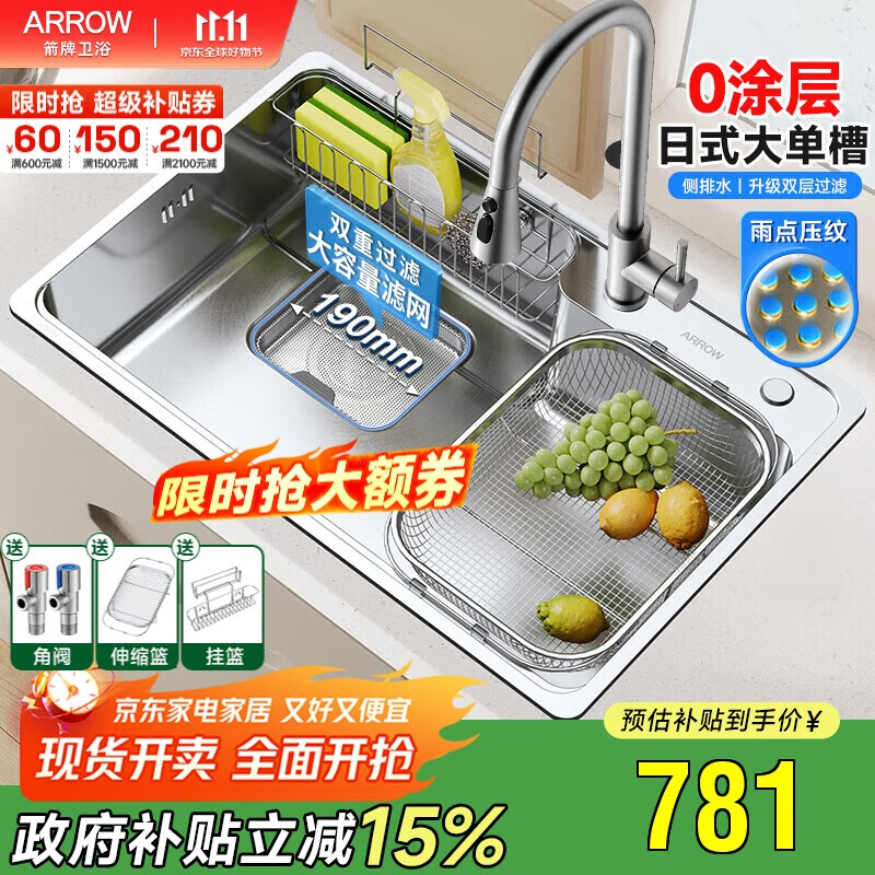 箭牌304不锈钢0涂层水槽大单槽集渣日式小户型洗菜池【政府补贴15%】