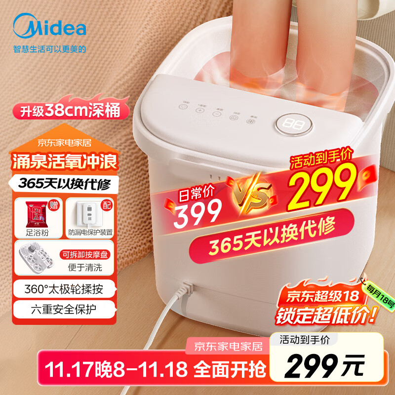 美的(Midea)泡脚桶按摩足浴盆加热暖脚自动按摩洗脚盆泡脚保暖盆理疗恒温高深桶生日礼物送男女友ZL305极地白
