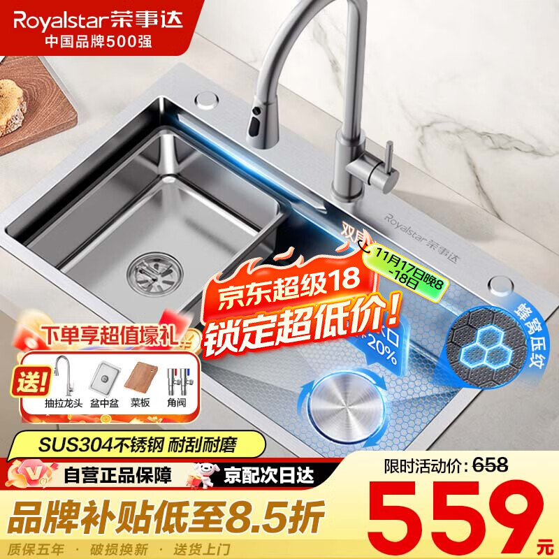荣事达(Royalstar)厨房水槽大单槽304不锈钢洗菜盆台阶蜂窝压纹台下洗碗槽淘菜池E3