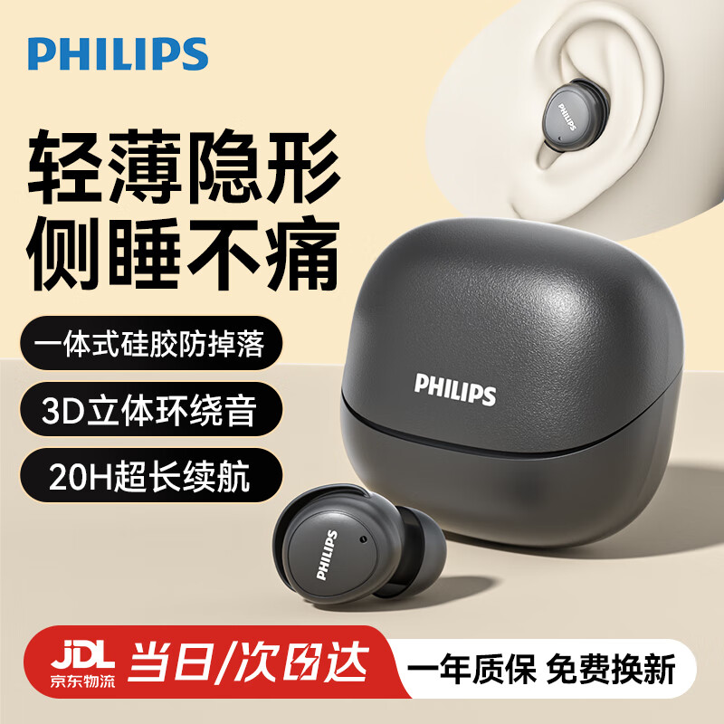 飞利浦(PHILIPS)豆式入耳耳机真无线蓝牙睡眠耳机超薄游戏耳机回音降噪超长续航通用苹果华为礼物TAT2320黑