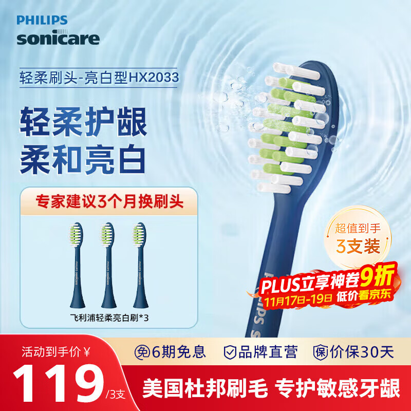 飞利浦(PHILIPS)电动牙刷头柔和亮白刷头适配5效宝藏刷HX2471系列亮白 官方旗舰店 柔和亮白3支装-深藏BlueHX2033/03