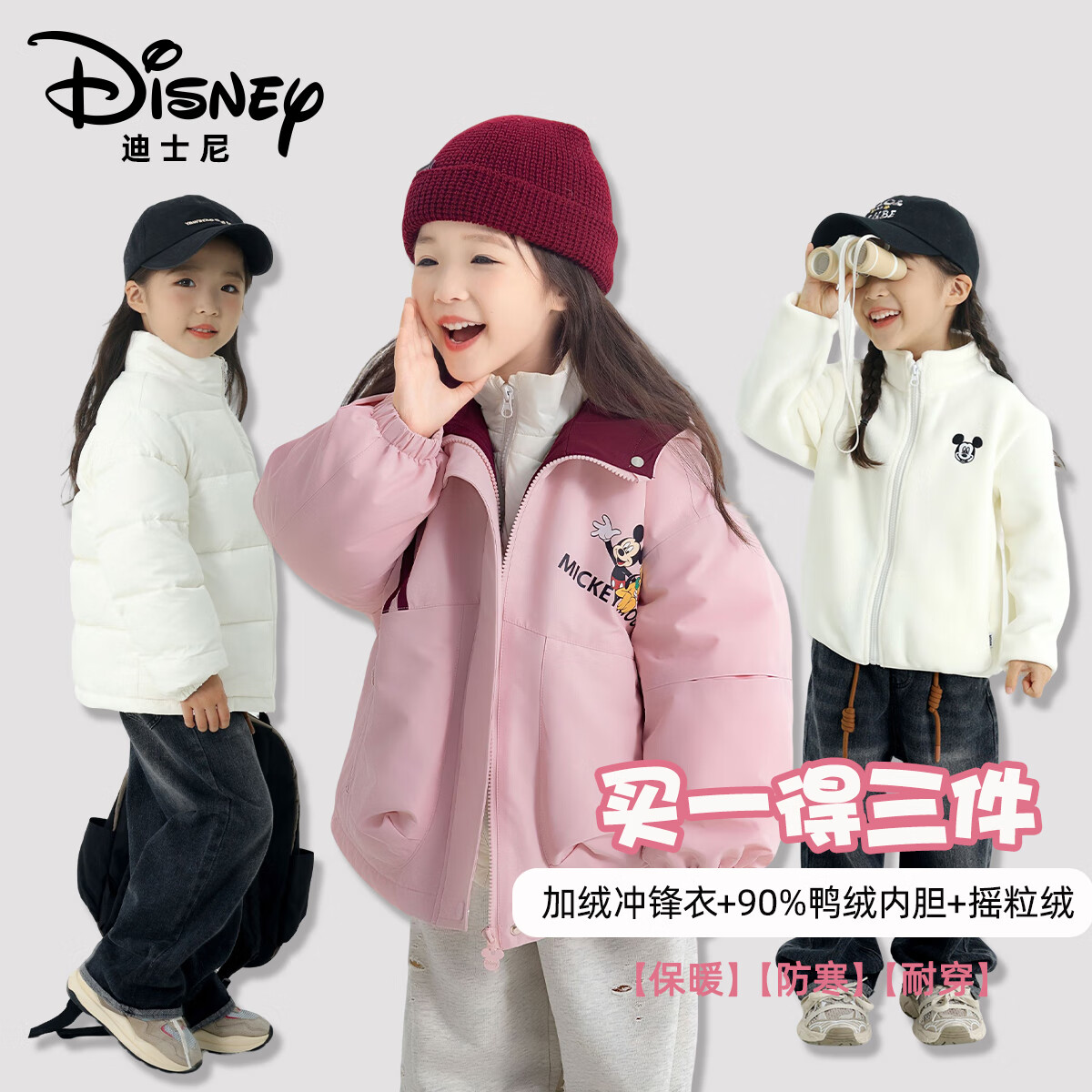 迪士尼儿童秋冬保暖白鸭绒羽绒服三件套男女童防寒加绒卡通棉服外套 粉色 (三件套) 160 (80-100斤)