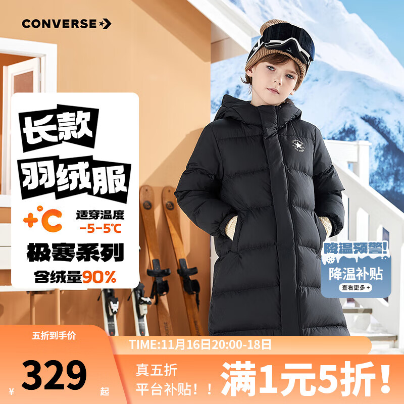 Converse匡威儿童羽绒服男女童冬季新款长款过膝中大童装极寒泡芙保暖外套 正黑色 160 充绒量约259g 【建议身高158-170cm】