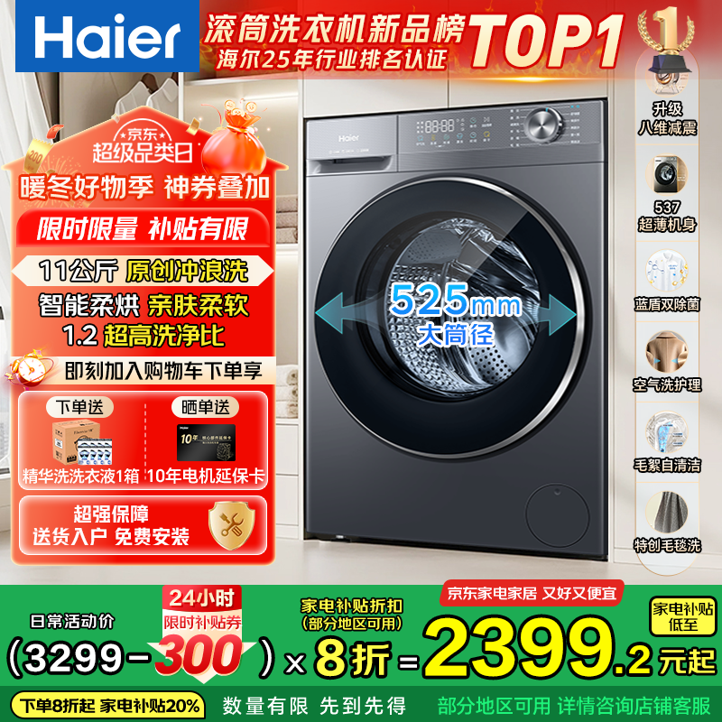 海尔(Haier)【25年超越新品58E】超薄滚筒洗衣机全自动变频 11公斤大容量全新八维减震 原创冲浪洗 国家补贴 11KG带烘干洗烘一体机+525大筒+1.2洗净比
