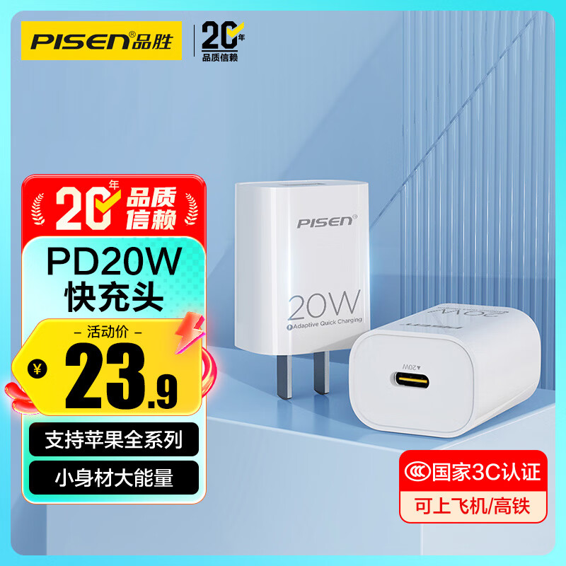 品胜3C认证苹果充电器PD20W快充iPhone17Air充电头type-c插头通用苹果16/15/14小米华为三星手机ipad