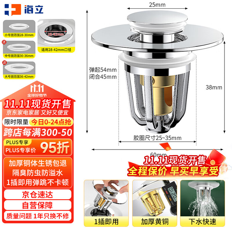 海立铜洗手脸盆池漏水塞按压弹跳下水器面盆弹跳芯28-42mm口径X10