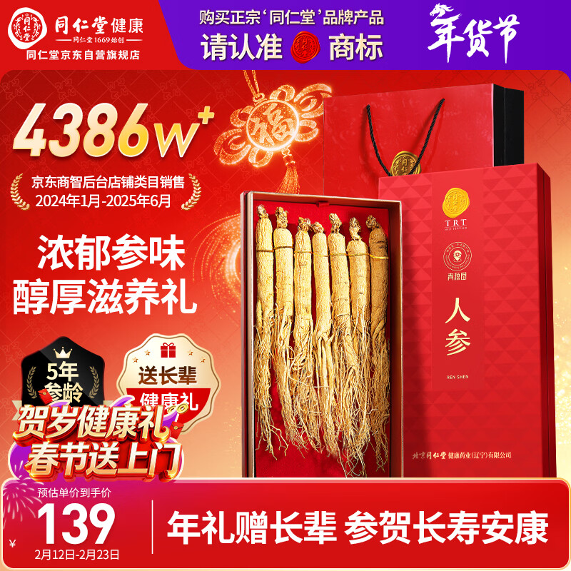 同仁堂品牌人参100克礼盒正宗长白山余脉人参5年人参泡酒送长辈父母年货
