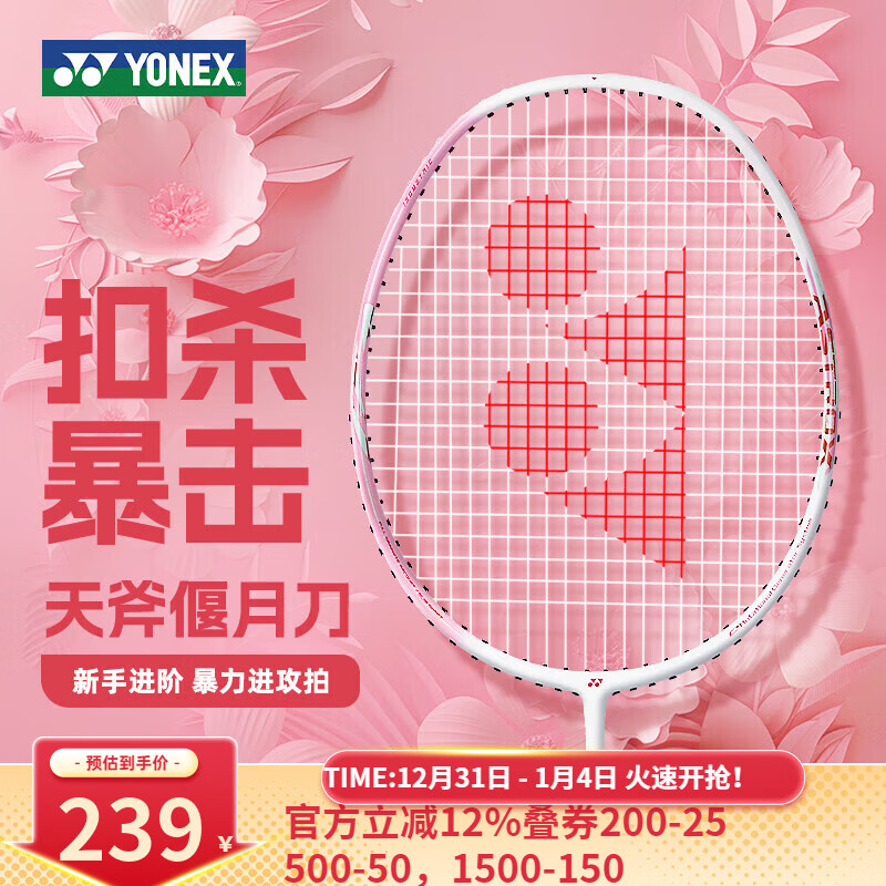 YONEX尤尼克斯羽毛球拍初学者yy超轻全碳素进攻型天斧AXSTK偃月刀单拍 天斧樱花刀AXSTKGC-西瓜粉4U5 带线带logo/假一赔十