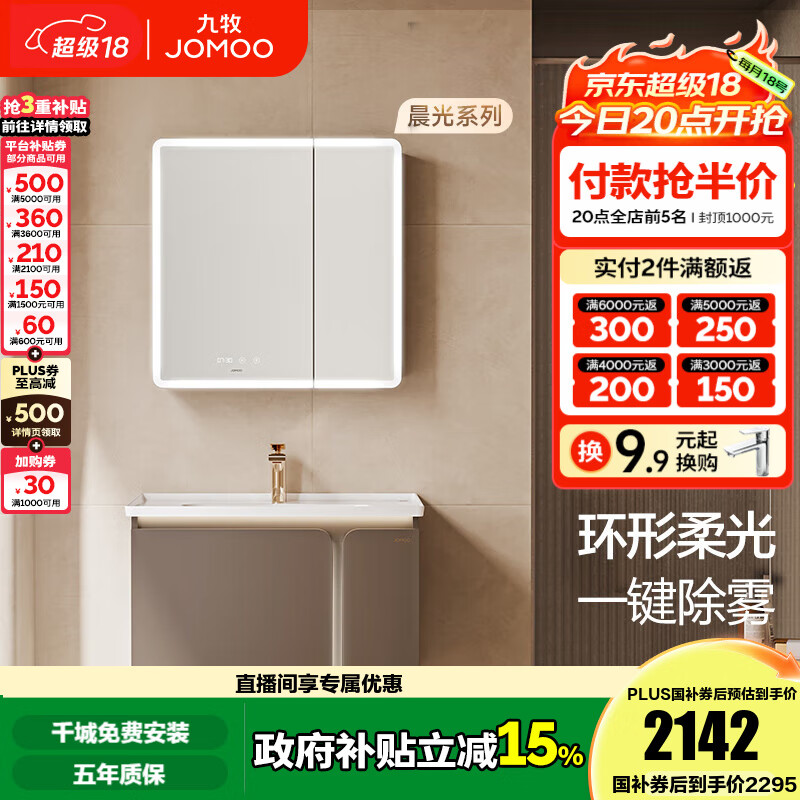 九牧(JOMOO)浴室柜陶瓷一体盆洗脸盆洗手盆组合柜洗漱台照明除雾收纳A2704 智能-可可亚麻色-无龙头80cm