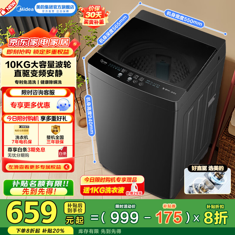 美的(Midea)全自动波轮洗衣机10公斤家用大容量V36DT直驱变频电机健康除螨洗10KG升级款出租房必备国家补贴20% 一级能效 MB100V36DT