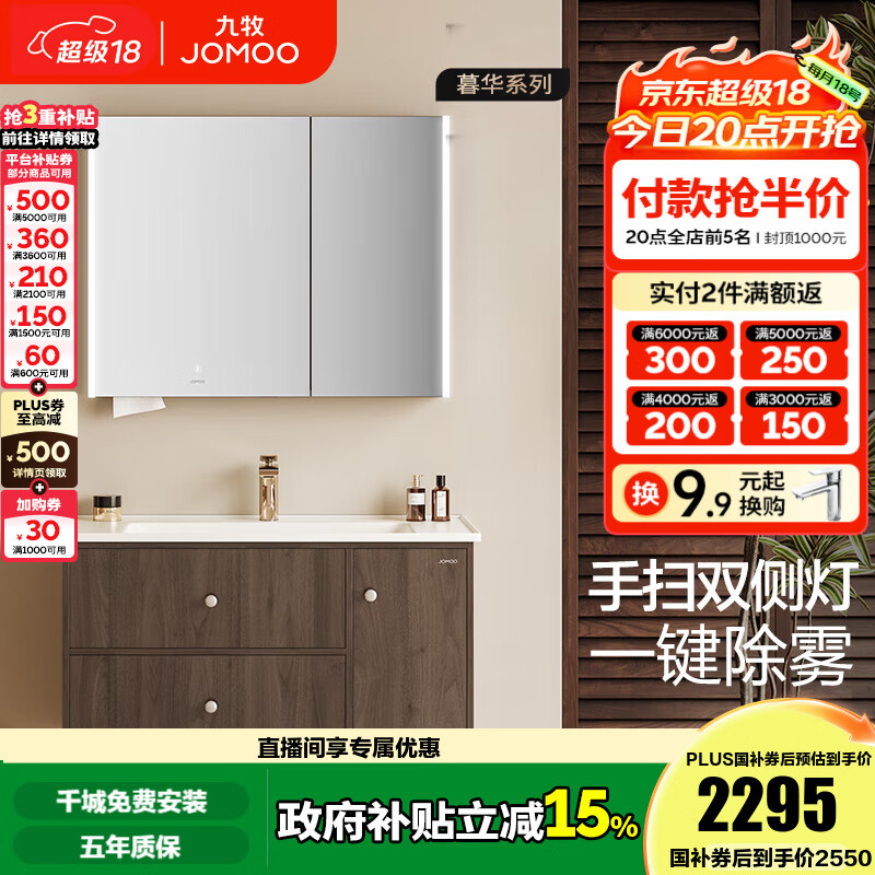九牧(JOMOO)浴室柜洗脸盆柜洗手盆柜组合一体盆陶瓷中古风卫生间洗漱台A2763 智能款 除雾|感应灯 无龙头100cm