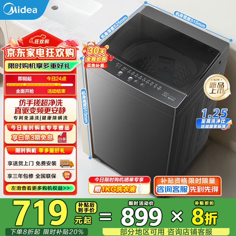 美的(Midea)波轮洗衣机全自动8kg大容量家用直驱变频专利免清洗立方内桶一级能效 MB80V36DT