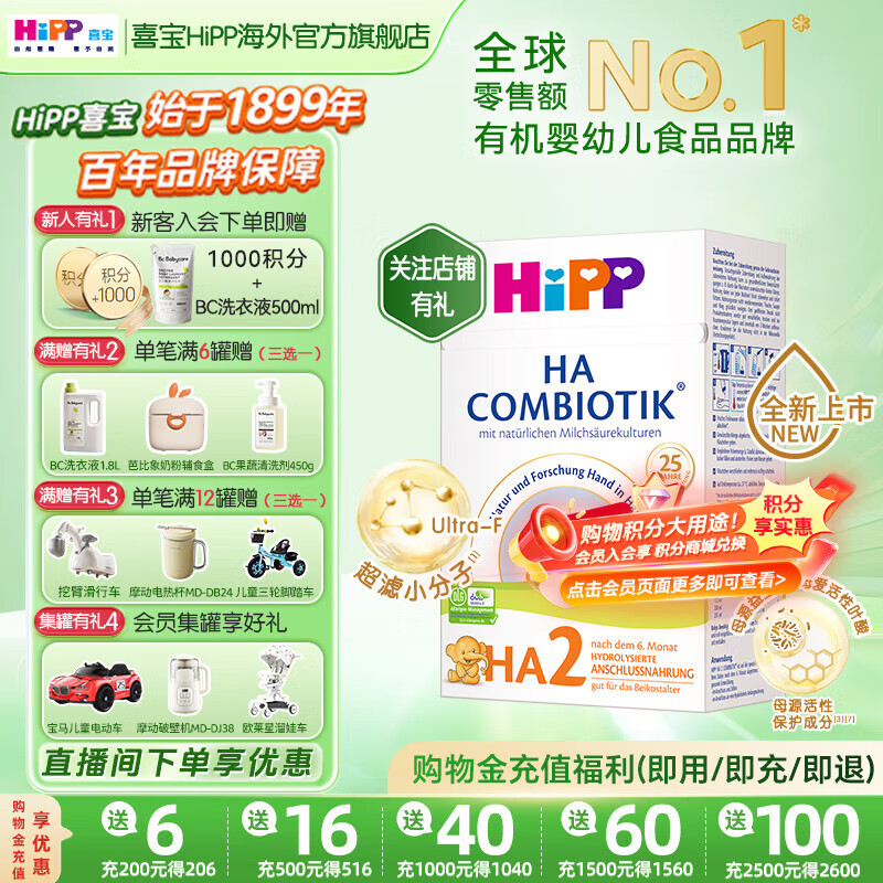 喜宝(HiPP) 德国HA超滤小分子水解奶粉 防敏 低敏婴幼儿配方奶粉 适度水解 【单罐】2段 6-24月(效期26.12)