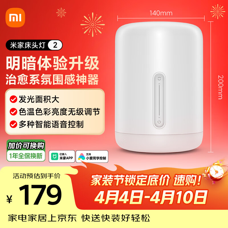 米家床头灯2 智能台灯卧室炫彩柔光夜灯创意礼物灯具可触控可语音调光