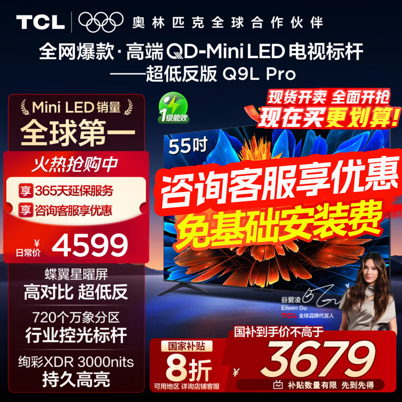 TCL电视 55Q9L Pro 55英寸 QD-Mini LED 蝶翼星曜屏 万象分区绚彩XDR3000nits超薄液晶电视机国家补贴 55英寸