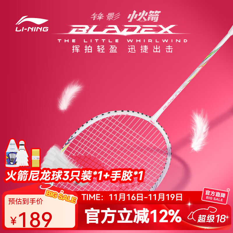 李宁羽毛球拍碳纤维全碳素单拍超轻小火箭高磅小钢炮专业比赛球拍 超轻全碳素(白色)已穿线
