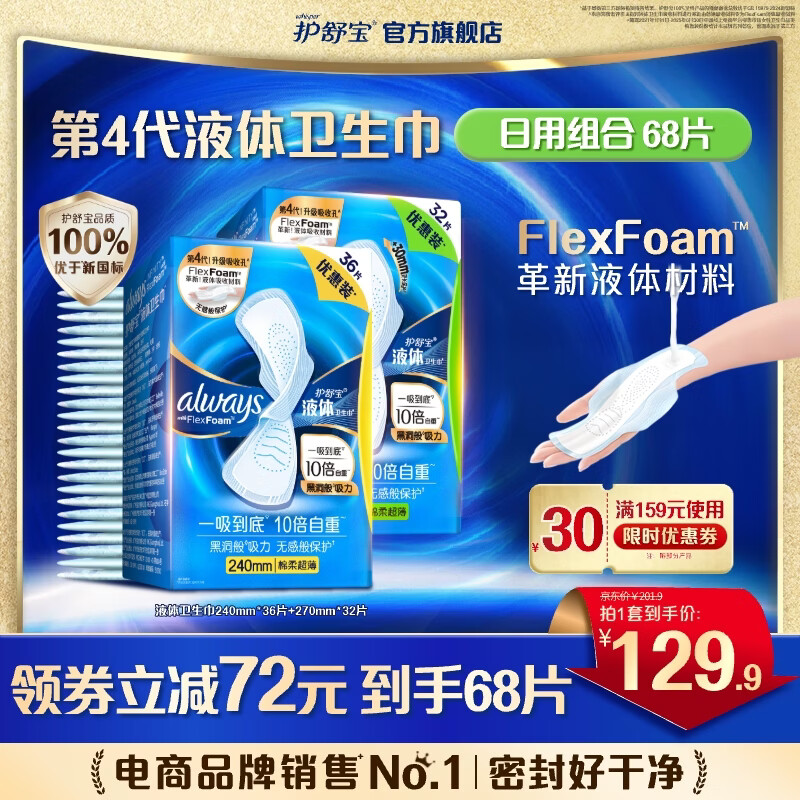 护舒宝进口液体卫生巾姨妈巾日用夜用超薄透气无感保护试用囤货官方旗舰 【液体68片】270*32+240*36