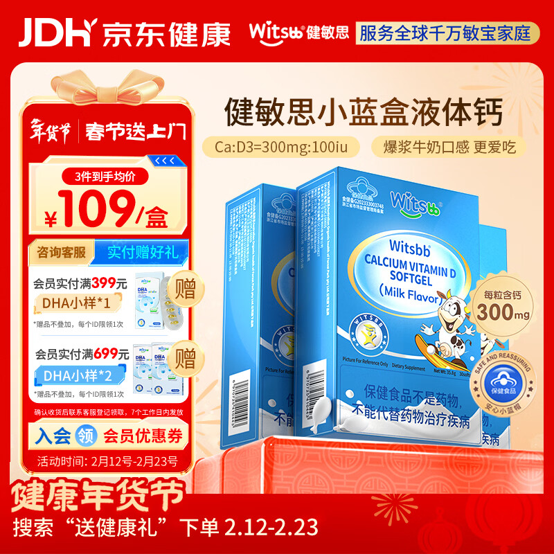 witsbb【春季补钙300mg】健敏思小蓝盒液体钙补钙含维生素d3*3盒装
