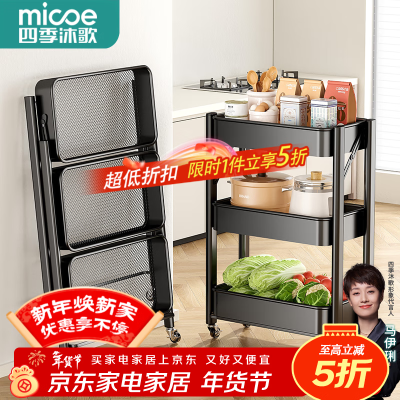 四季沐歌厨房置物架落地折叠小推车置物架免安装零食收纳储物移动果蔬菜篮 3层耀黑【可折叠】常规款