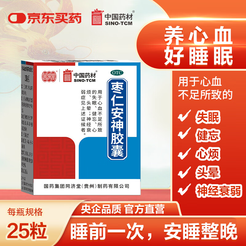 中国药材同济堂 枣仁安神胶囊 0.45g*25粒/瓶 养血安神 用于心血不足导致的失眠 健忘 心烦