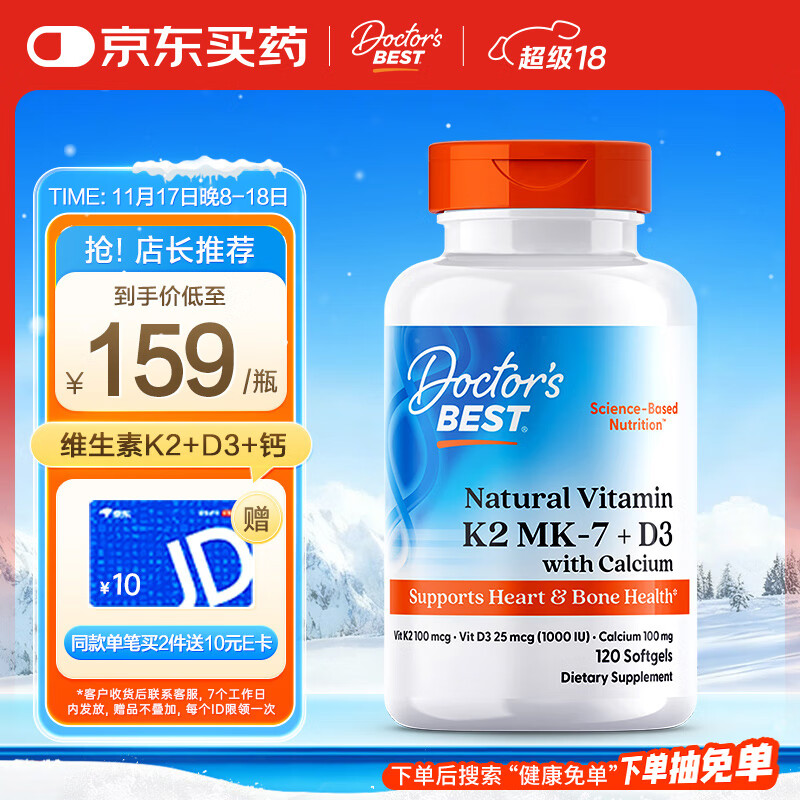 Doctor's best多特倍斯 液体钙维生素K2D3柠檬酸钙成人孕妇补钙中老年钙片120粒