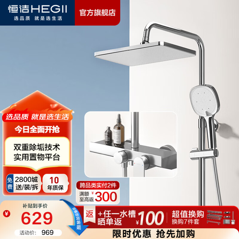 恒洁(HEGII) 淋浴花洒套装 智能除垢大顶喷置物平台多功能可升降花洒全套 【自动除垢-银色】936-333