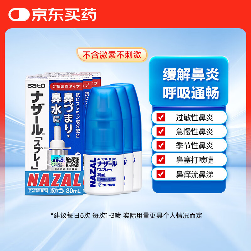 日本佐藤sato鼻炎喷剂 雾剂30ml*3瓶 nazal原味治疗过敏性急性特效果症状原装进口儿童鼻炎耳鼻喉用药专用