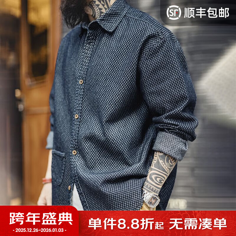 马登工装美式复古棋盘格子牛仔衬衫男秋季宽松翻领格纹长袖上衣夹克 特深兰 /牛仔面料请【单独洗涤】 M