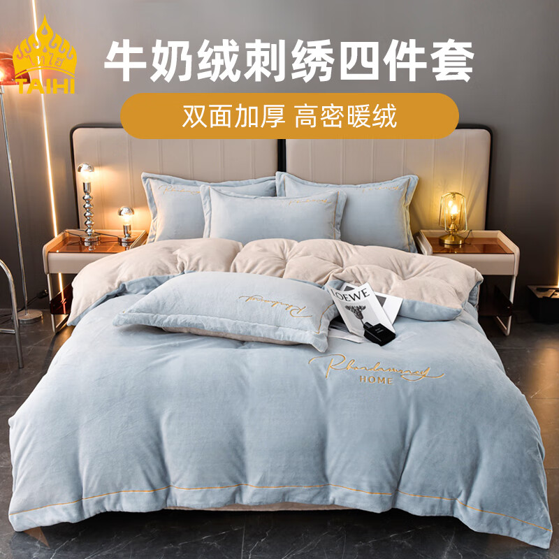泰嗨(TAIHI)家纺床上四件套 牛奶绒刺绣 四件套秋冬保暖床单 四件套 青山灰 1.5/1.8床 床单款 【200*230cm】