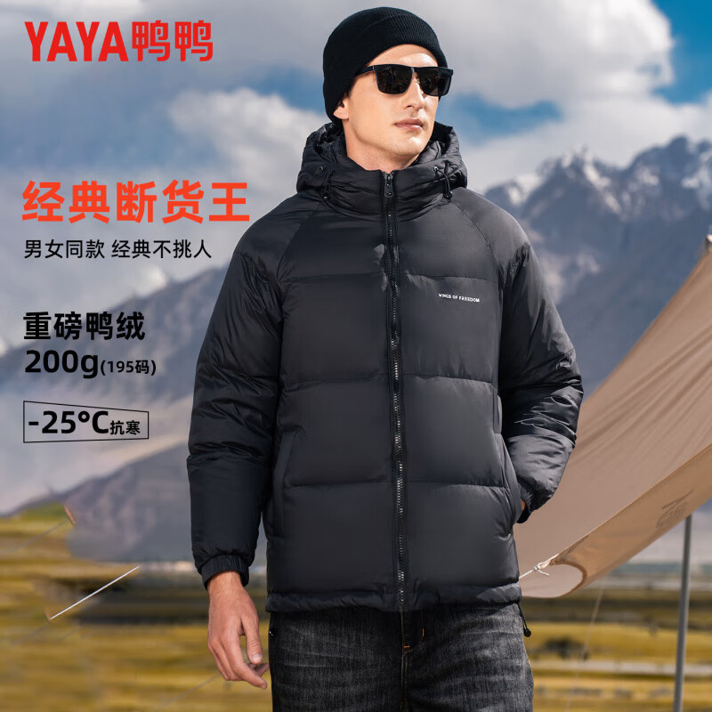 鸭鸭(YAYA)羽绒服男女同款连帽短款高充绒厚款面包服2025冬季新款情侣外套 黑色 L (175)【建议125-140斤】