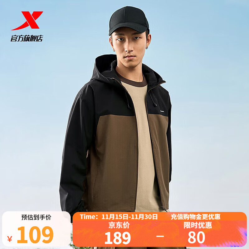 特步(XTEP)连帽双层风衣春秋新款外套男士宽松休闲夹克百搭运动防风上衣 正黑色 2XL