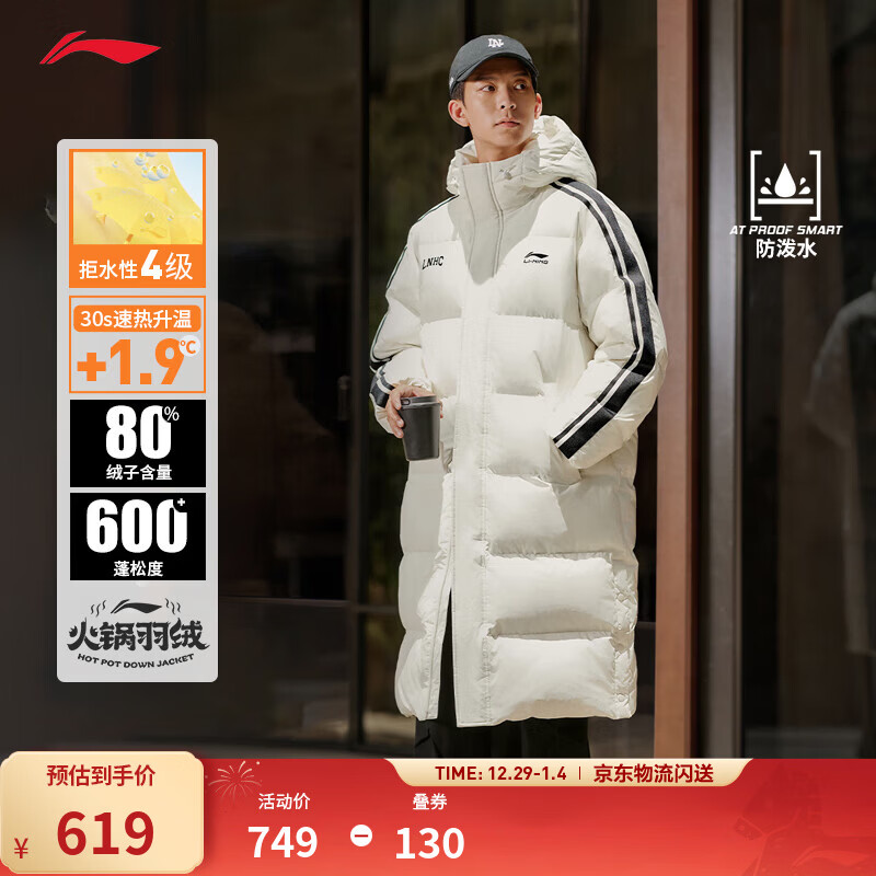 李宁热浪羽绒服丨男秋冬季防泼水科技时尚百搭80%鸭绒长款运动外套 乳白色(449)-2 L