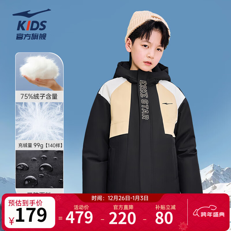 鸿星尔克童装儿童羽绒服男童女童羽绒服新年款拜年简约保暖羽绒外套 正黑-绒子含量75% 170 充绒量151g