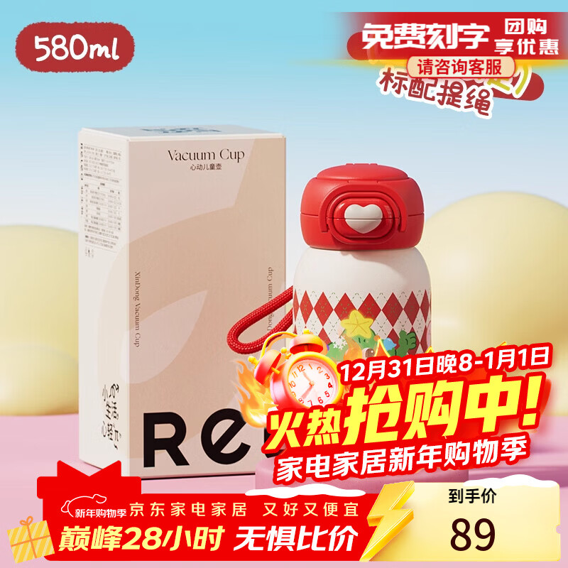 物生物儿童保温杯吸管水杯316L不锈钢学生上学双饮杯女士高颜值新年礼物 圣诞限定款 580ml【自带提绳】