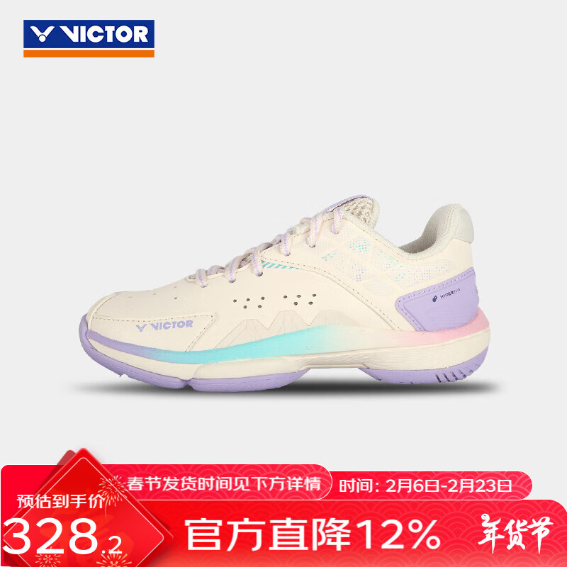 威克多(VICTOR)羽毛球鞋 儿童透气轻量软弹缓震童楦设计稳定类羽球鞋 P8500JR LJ(暖白/薰衣草紫) 33 (205mm)